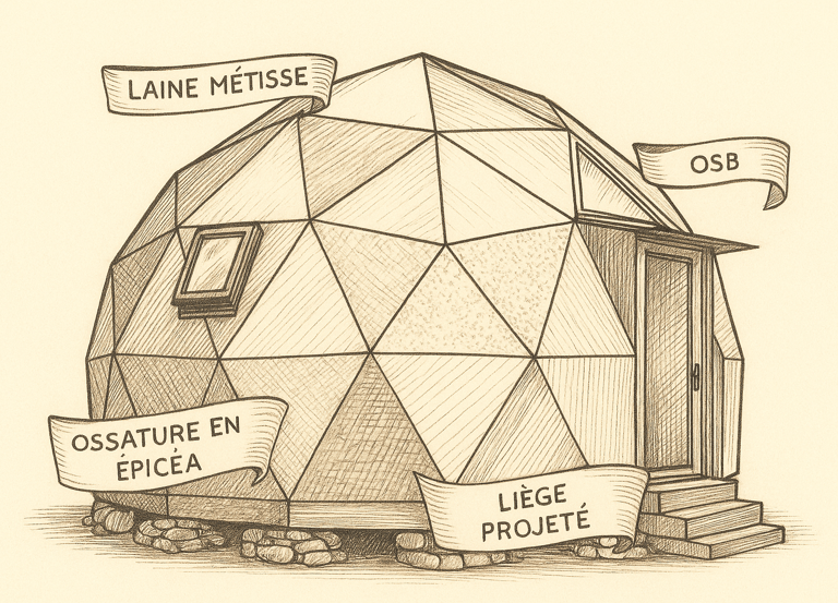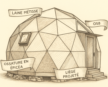 Efficacité énergétique: Notre dôme procure une sensation de chaleur et de confort semblable à un cocon. Avec une laine métisse de 20 cm assurant un déphasage de 7 heures, notre dôme maintient une température intérieure confortable, même par temps extrême. (Le déphasage correspond au temps nécessaire pour que la chaleur traverse cette paroi et pénètre à l'intérieur du bâtiment).